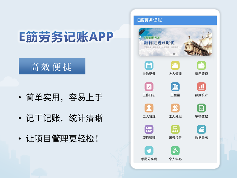 E筋勞務記賬是一款高效便捷的記賬軟件,功能包括批量記工、收支管理、工人對賬等模塊。可以快速記賬,多人管理,隨時掌握項目進度和收支情況。統計清晰,讓項目管理更加輕鬆便捷。